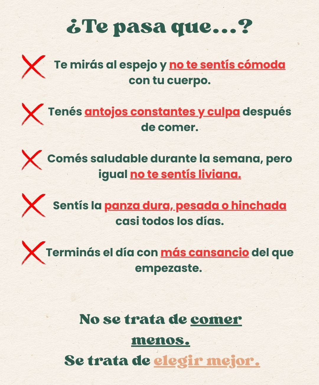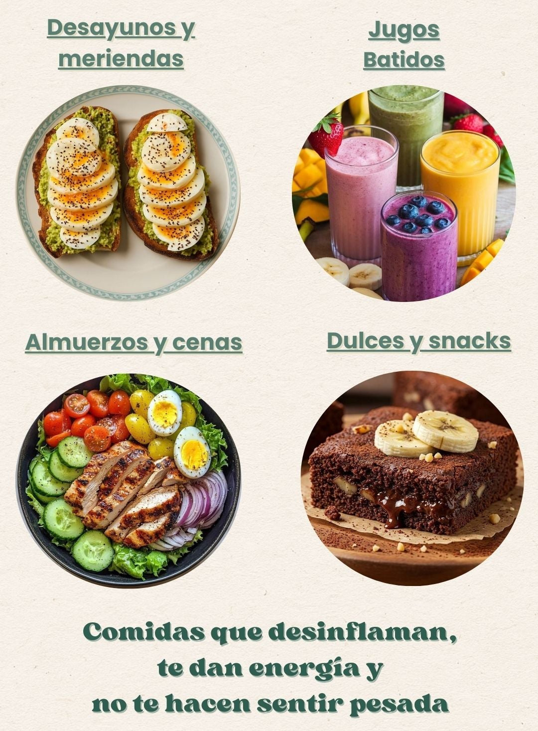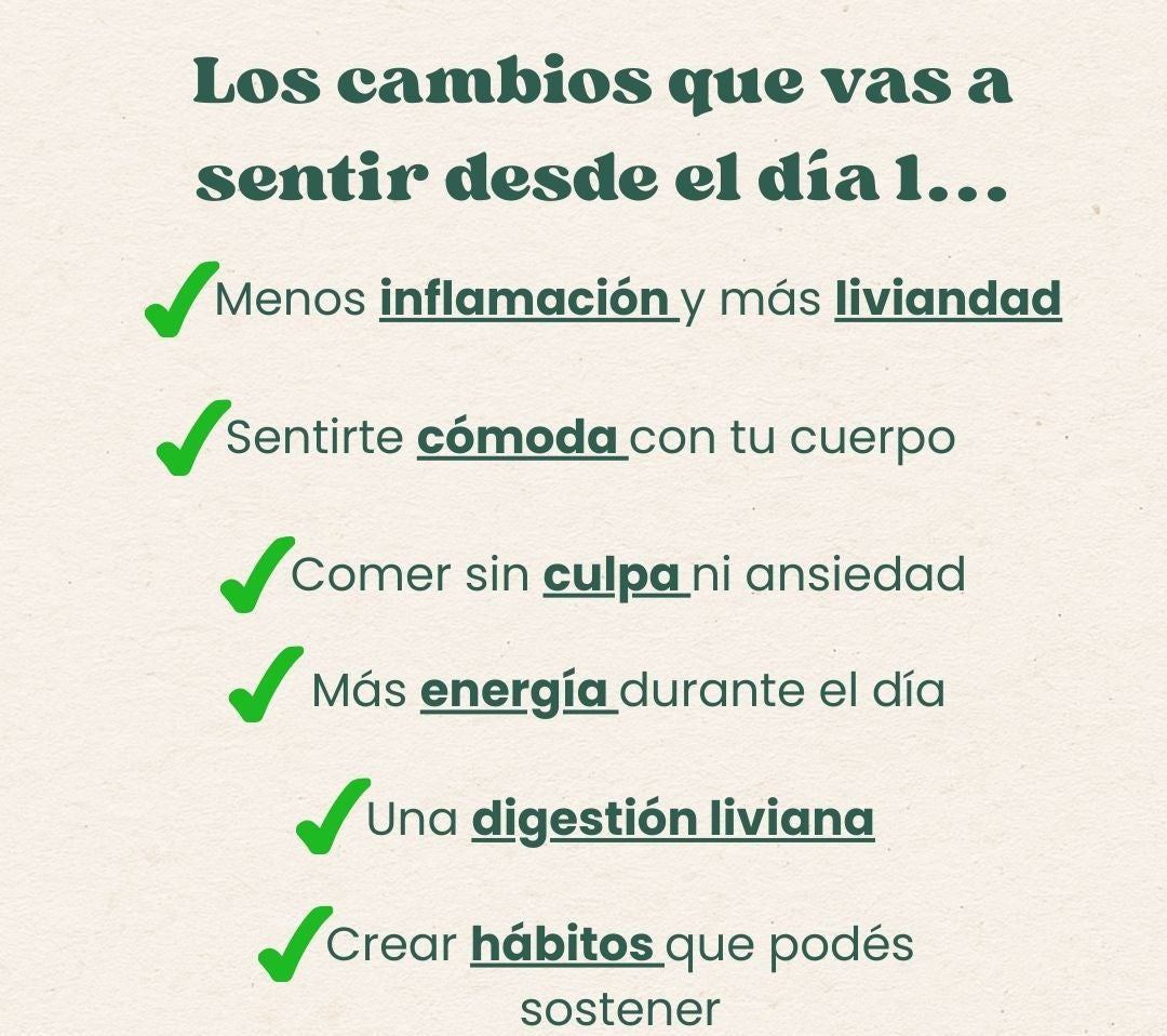 No, este plan no se basa en prohibiciones ni en pasar hambre. Aprendés a combinar alimentos reales para desinflamar tu cuerpo, sentirte liviana y comer rico sin culpa.